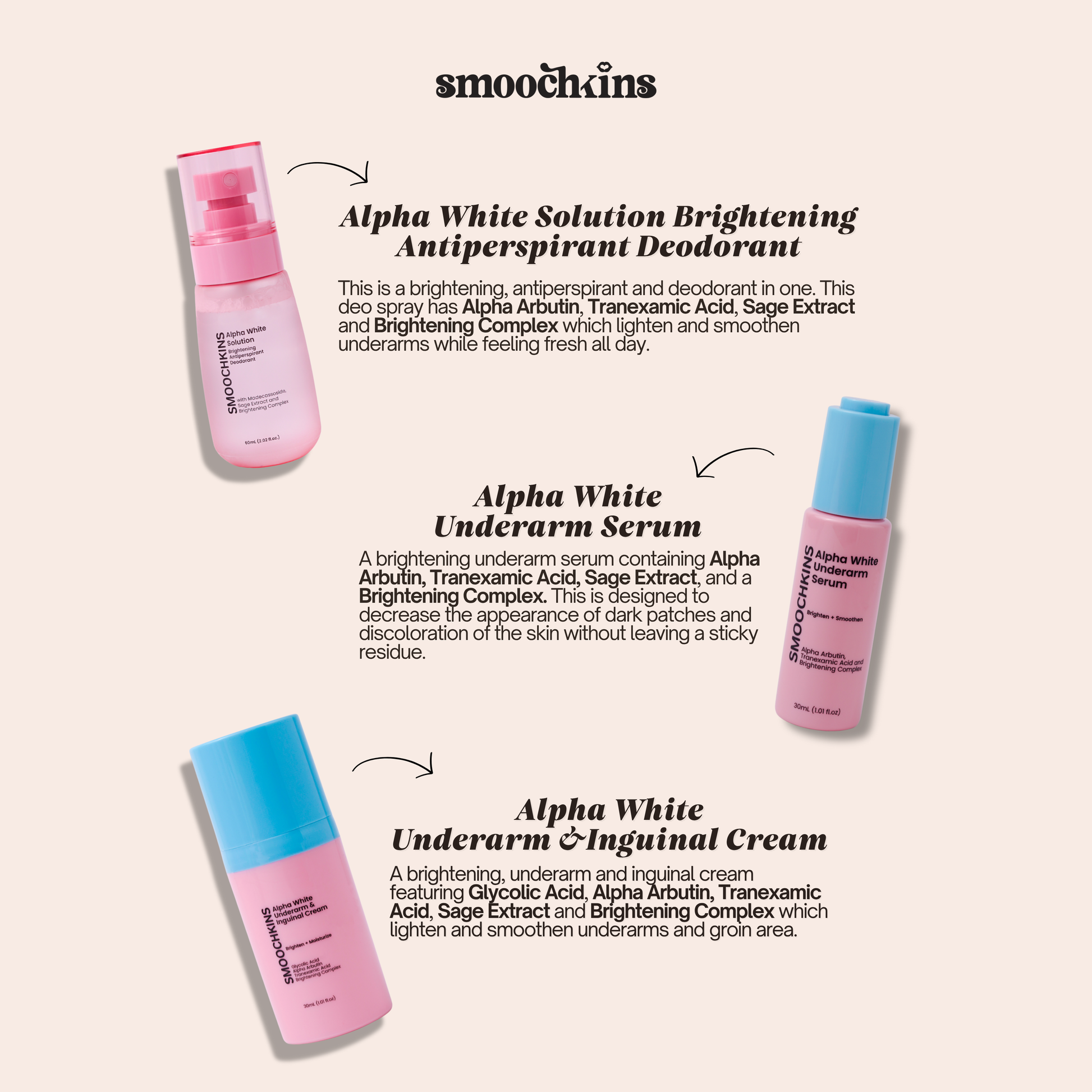 Smoochkins Alpha White Underarm Whitening Set (Brightening Antiperspirant Deodorant, Underarm & Inguinal Cream, Underarm Serum)